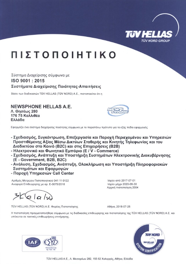Οι παρεχόμενες υπηρεσίες και οι διαδικασίες που ακολουθούνται στη NEWSPHONE είναι στο σύνολό τους πιστοποιημένες κατά ISO 9001:2015, από την TUV HELLAS (TUV NORD) Α.Ε.